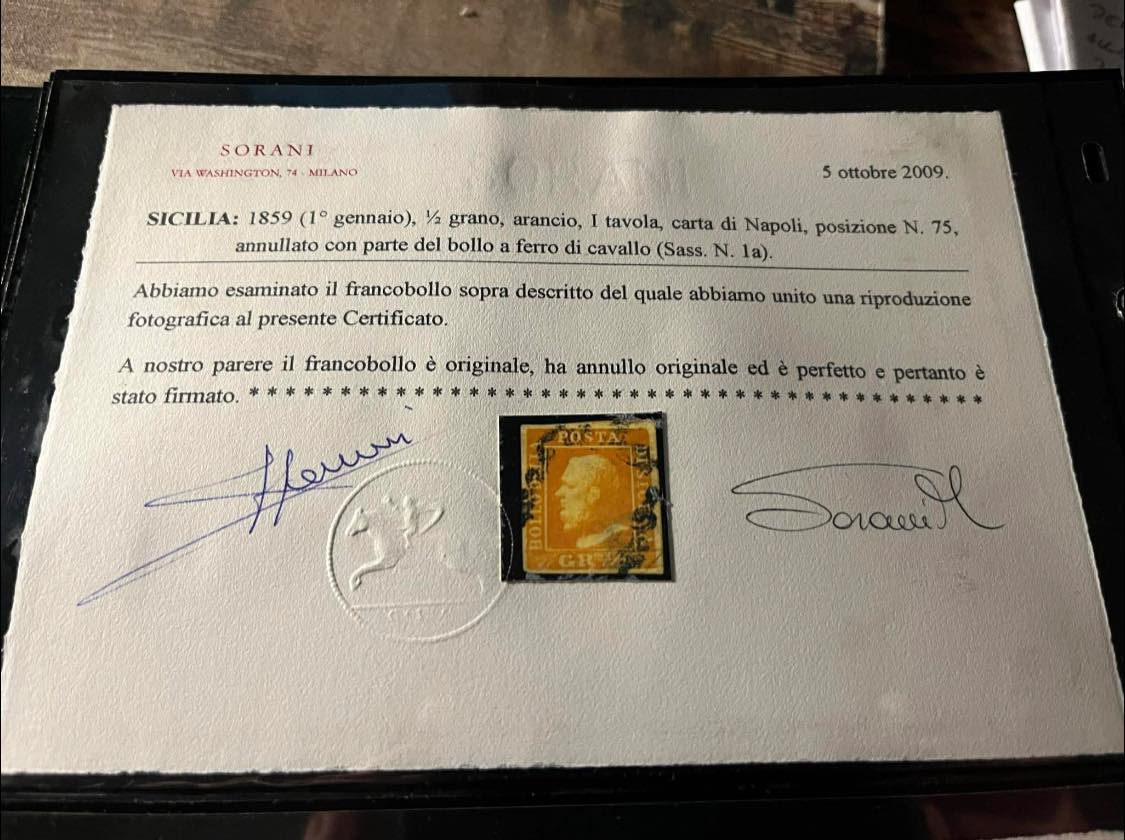 Sicilia sassone N°1a arancio I tavola posizione 75, siglato da Enzo Diena, certificato Sorani;